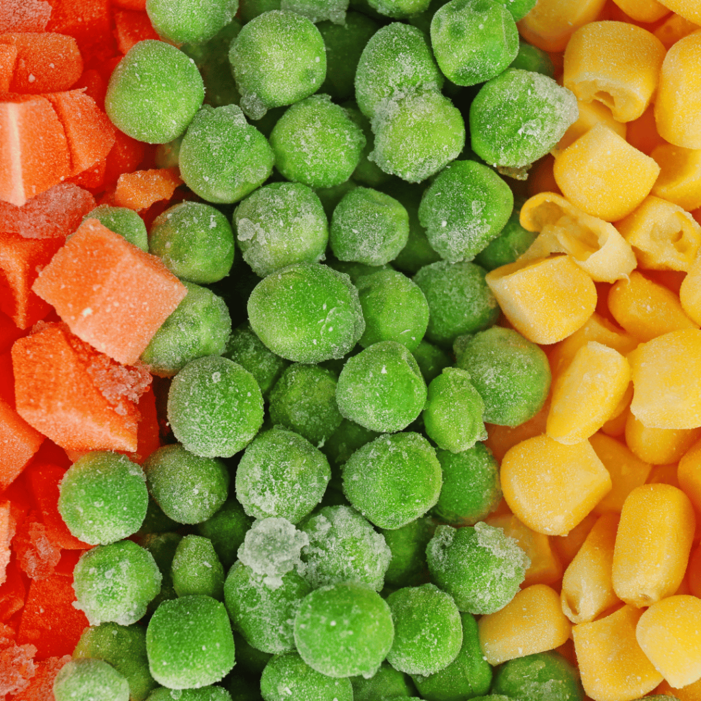 Guisantes, maíz, zanahorias, brócoli y verduras mixtas, cuidadosamente seleccionadas y congeladas en su punto óptimo de maduración.